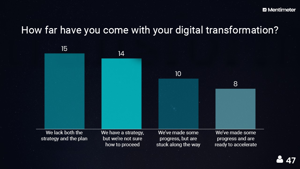 In a recent seminar we asked the audience where they were on their digital transformation journey. This is a small sample, but it reflects reality quite well based on our conversations with Fluido customers. This is a great opportunity for us all: Inspired by this, we have created a series of workshops together with our partner Next State Labs in Stockholm to help companies take the right steps and succeed in their digital transformation journey.
