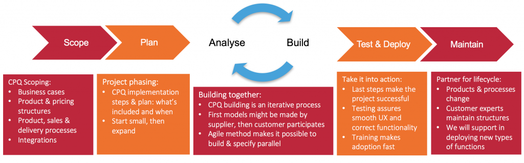A key to fluent CPQ implementations is starting with a definition phase, which brings the customer and supplier closer together in terms of product and technology understanding. This is an iterative process: when supplier learns more about customer’s products’ they are better able to define how the customer’s needs could be tackled with the platform-provided functionality. One possible approach to CPQ projects is as follows:​
